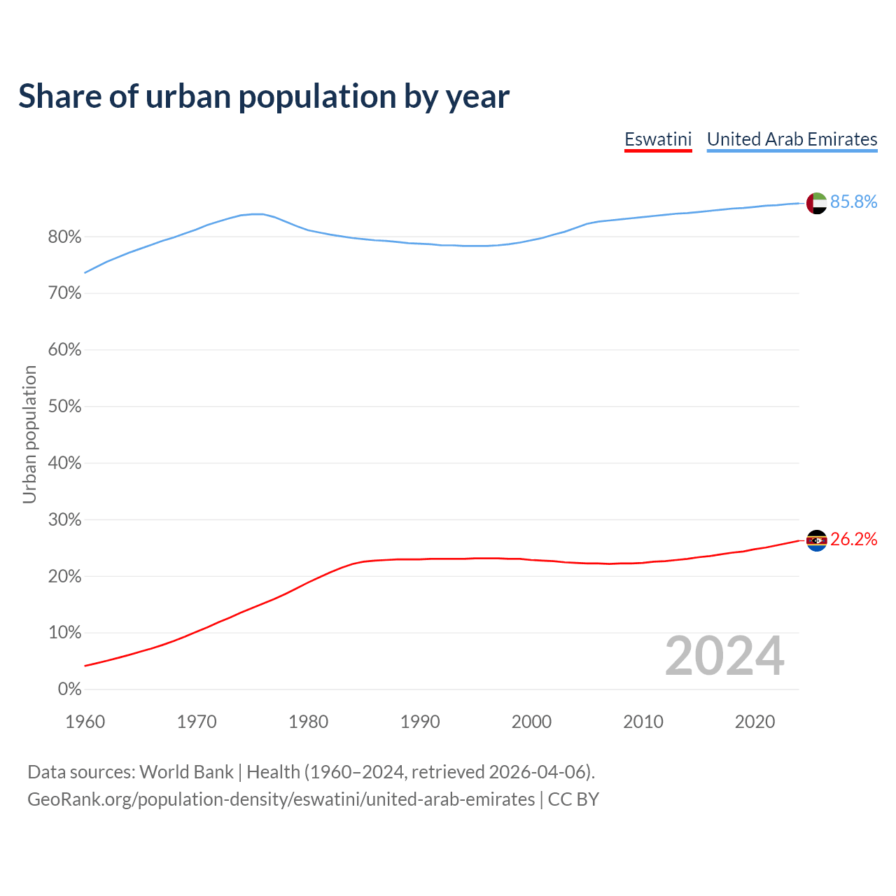 From 2004 to 2024, the share of urban population changed from 22.3% to 26.2% in Eswatini and from 81.5% to 85.8% in the United Arab Emirates.