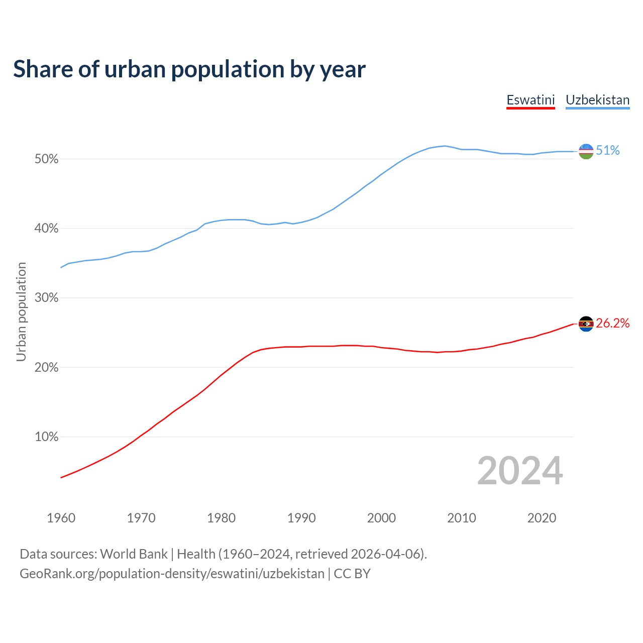 From 2004 to 2024, the share of urban population changed from 22.3% to 26.2% in Eswatini and from 50.6% to 51% in Uzbekistan.