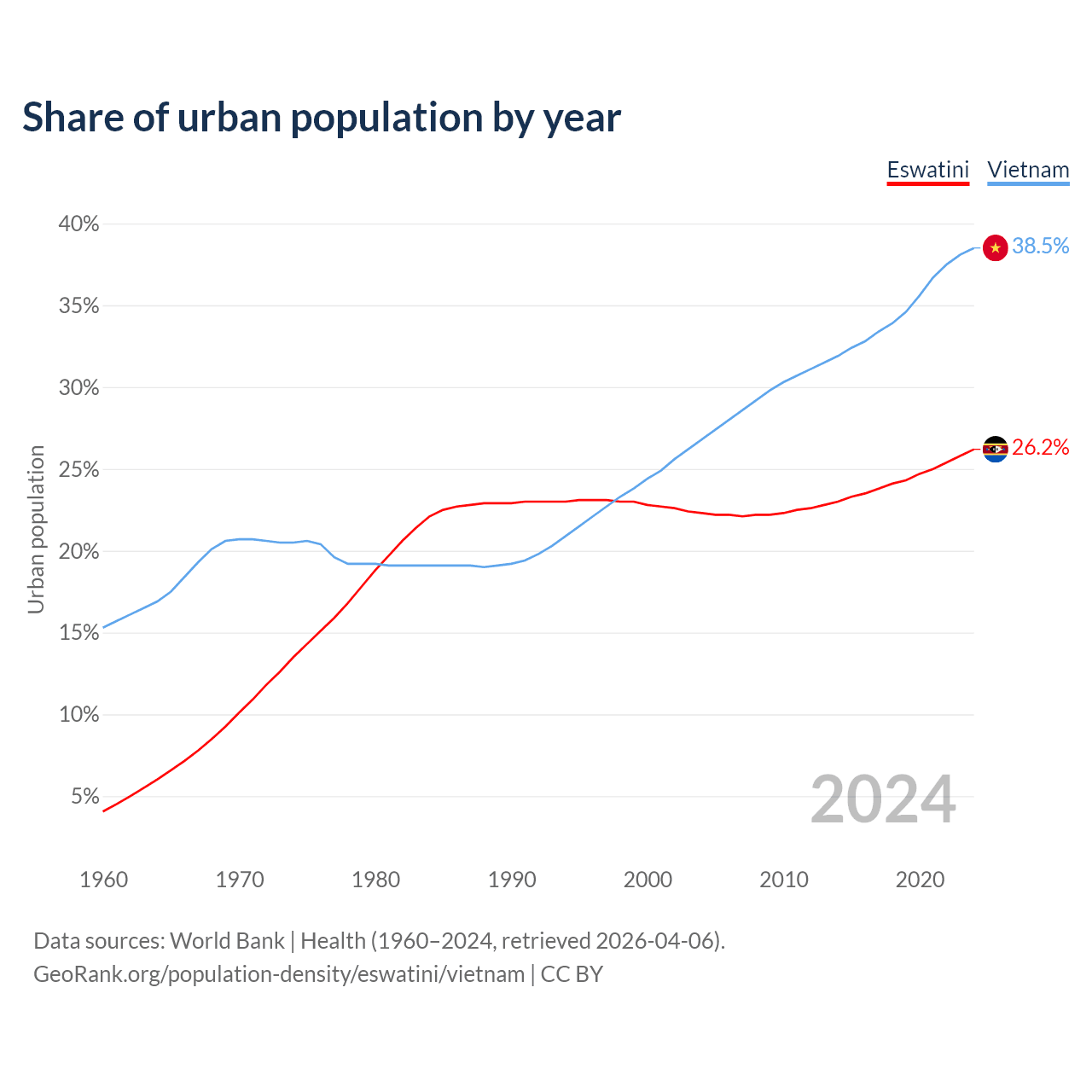 From 2004 to 2024, the share of urban population changed from 22.3% to 26.2% in Eswatini and from 26.8% to 38.5% in Vietnam.
