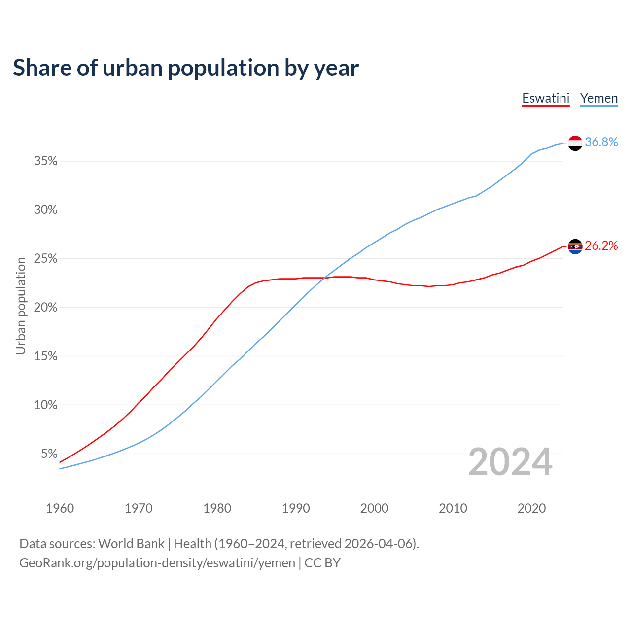 From 2004 to 2024, the share of urban population changed from 22.3% to 26.2% in Eswatini and from 28.5% to 36.8% in Yemen.