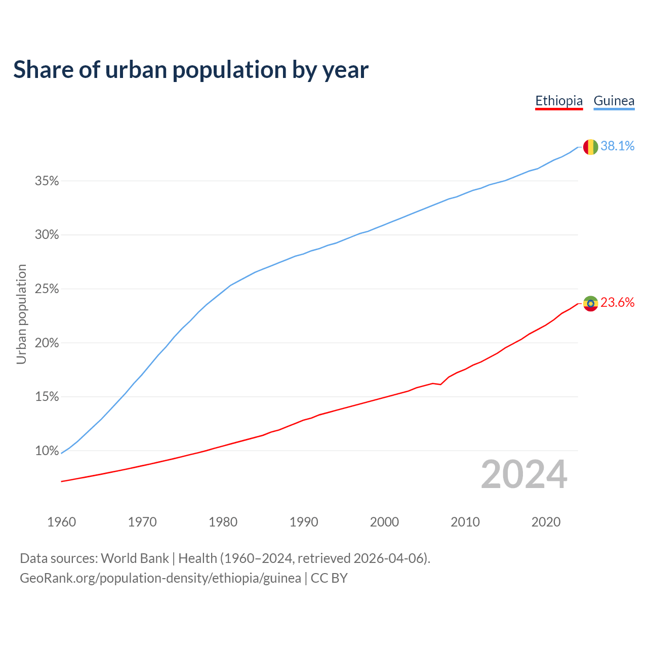 From 2004 to 2024, the share of urban population changed from 15.8% to 23.6% in Ethiopia and from 32.1% to 38.1% in Guinea.