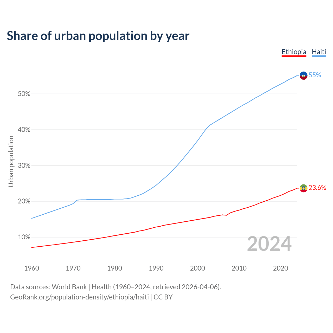 From 2004 to 2024, the share of urban population changed from 15.8% to 23.6% in Ethiopia and from 41.9% to 55% in Haiti.