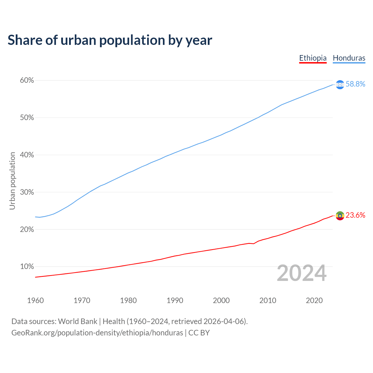 From 2004 to 2024, the share of urban population changed from 15.8% to 23.6% in Ethiopia and from 47.6% to 58.8% in Honduras.