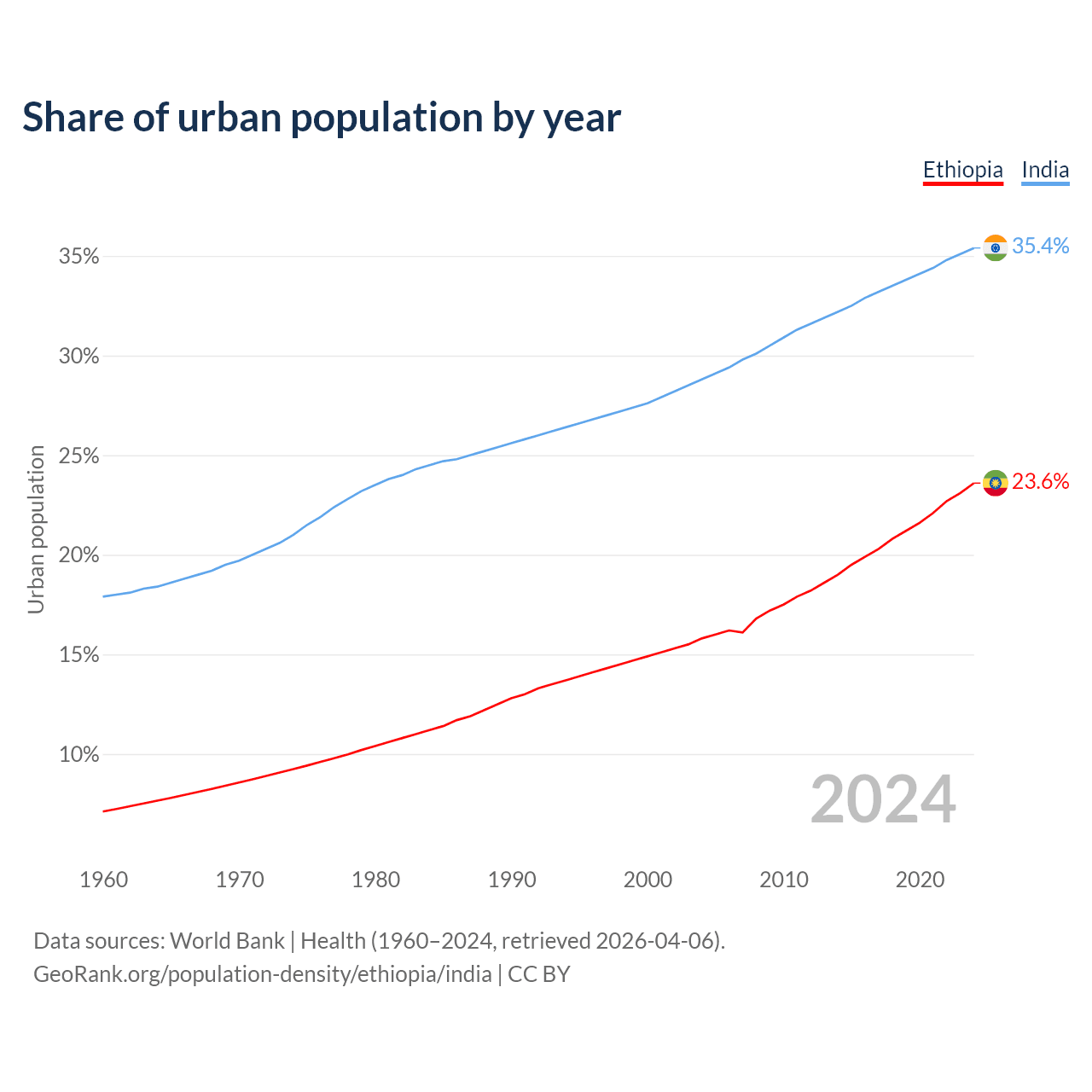 From 2004 to 2024, the share of urban population changed from 15.8% to 23.6% in Ethiopia and from 28.8% to 35.4% in India.