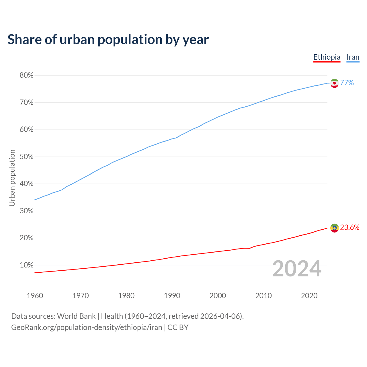 From 2004 to 2024, the share of urban population changed from 15.8% to 23.6% in Ethiopia and from 67.3% to 77% in Iran.