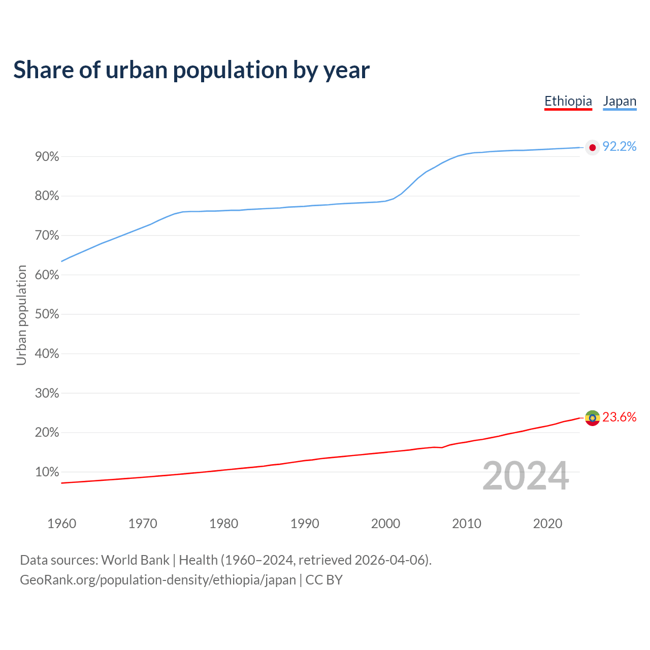 From 2004 to 2024, the share of urban population changed from 15.8% to 23.6% in Ethiopia and from 84.4% to 92.2% in Japan.
