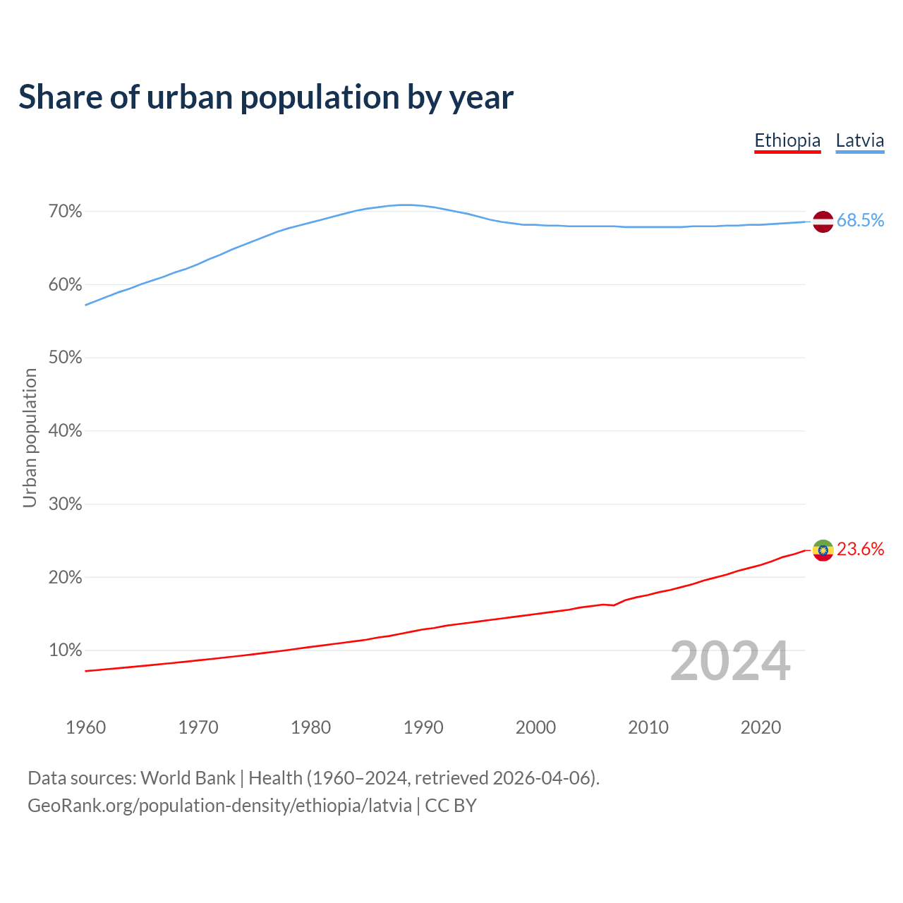 From 2004 to 2024, the share of urban population changed from 15.8% to 23.6% in Ethiopia and from 67.9% to 68.5% in Latvia.