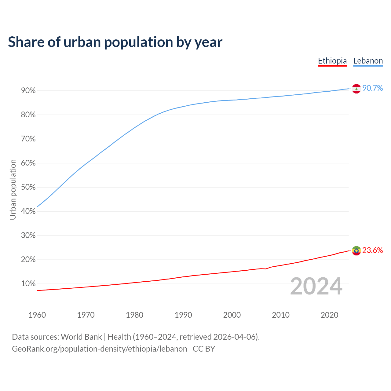 From 2004 to 2024, the share of urban population changed from 15.8% to 23.6% in Ethiopia and from 86.6% to 90.7% in Lebanon.