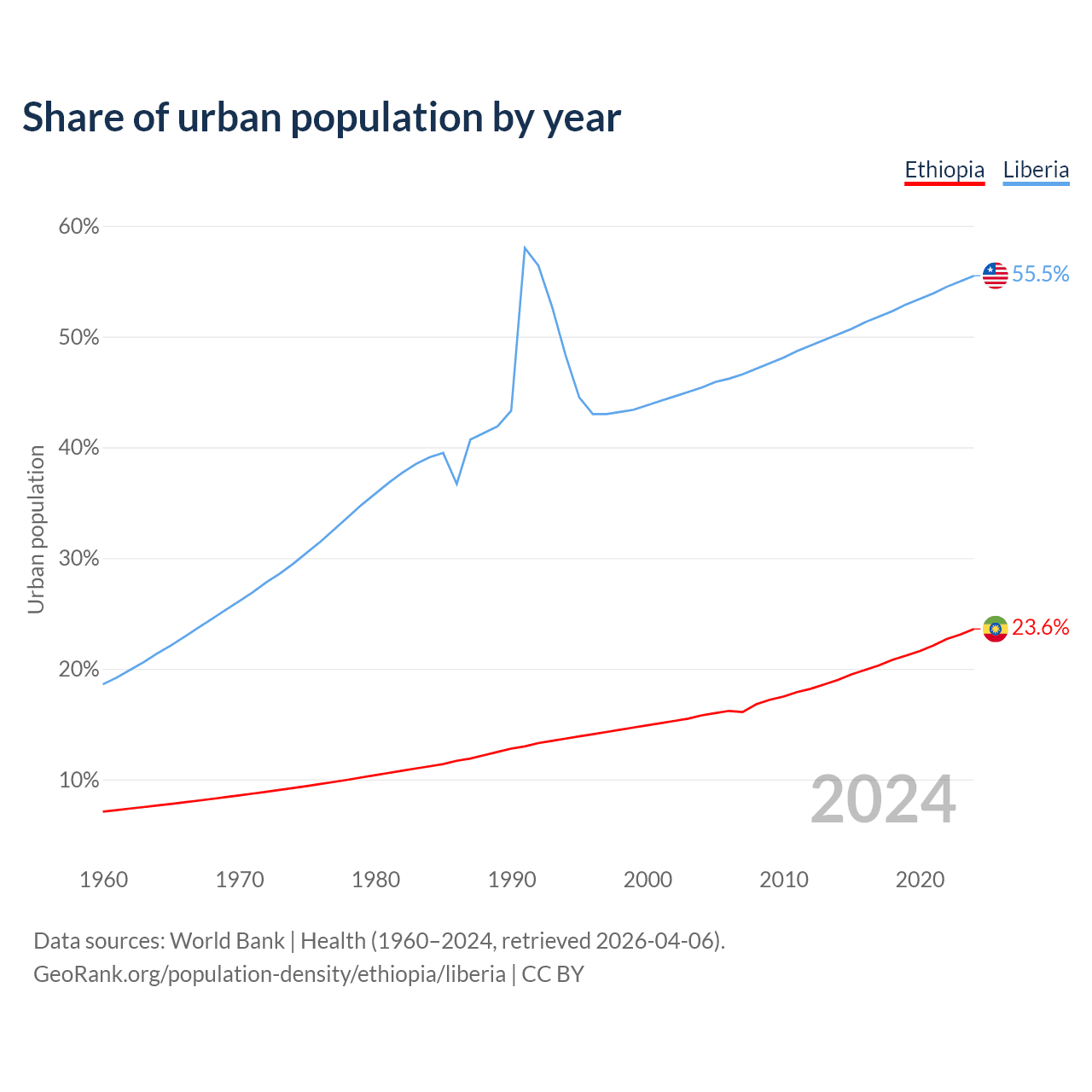 From 2004 to 2024, the share of urban population changed from 15.8% to 23.6% in Ethiopia and from 45.4% to 55.5% in Liberia.