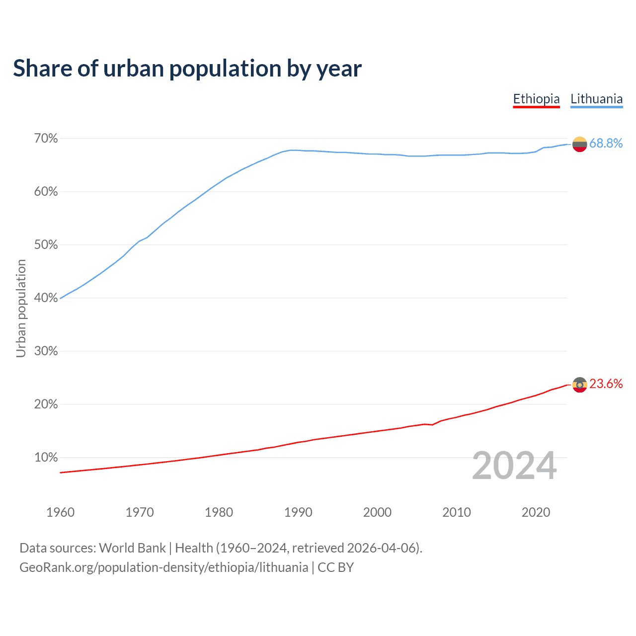 From 2004 to 2024, the share of urban population changed from 15.8% to 23.6% in Ethiopia and from 66.6% to 68.8% in Lithuania.