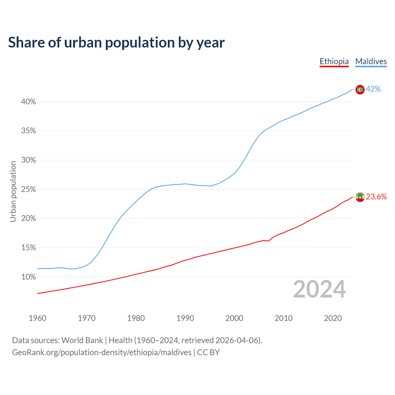 From 2004 to 2024, the share of urban population changed from 15.8% to 23.6% in Ethiopia and from 32.9% to 42% in Maldives.
