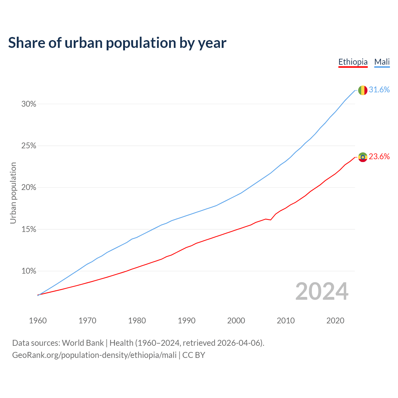 From 2004 to 2024, the share of urban population changed from 15.8% to 23.6% in Ethiopia and from 20.5% to 31.6% in Mali.