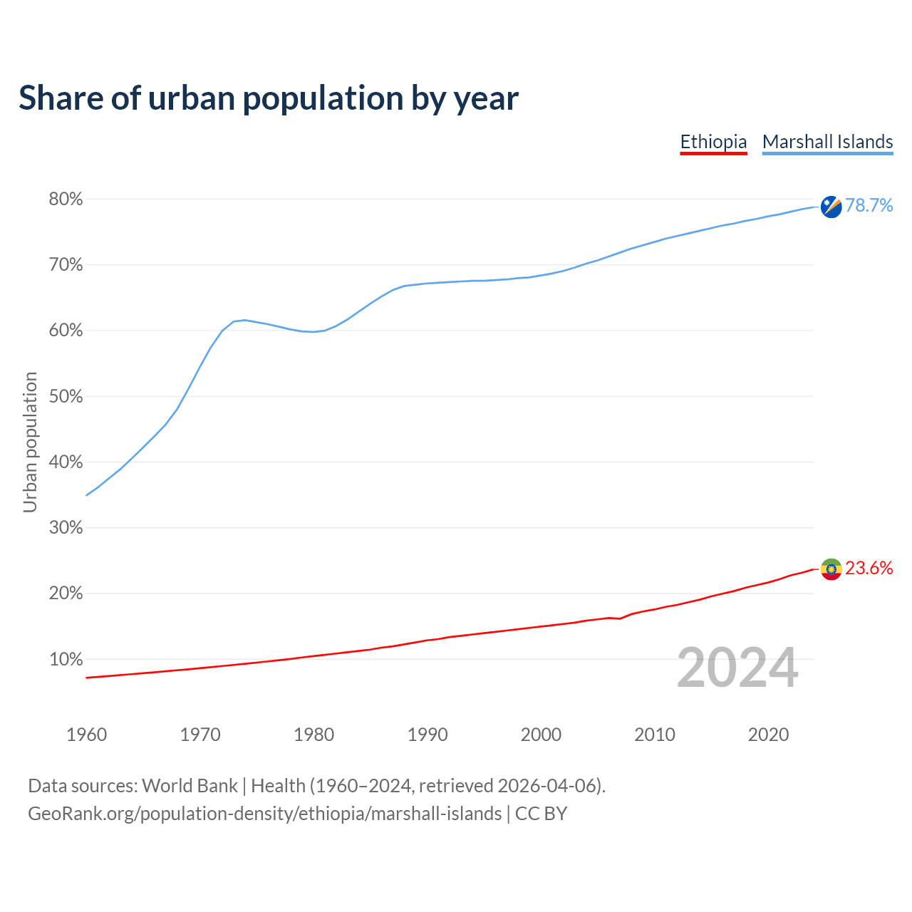 From 2004 to 2024, the share of urban population changed from 15.8% to 23.6% in Ethiopia and from 70.1% to 78.7% in the Marshall Islands.