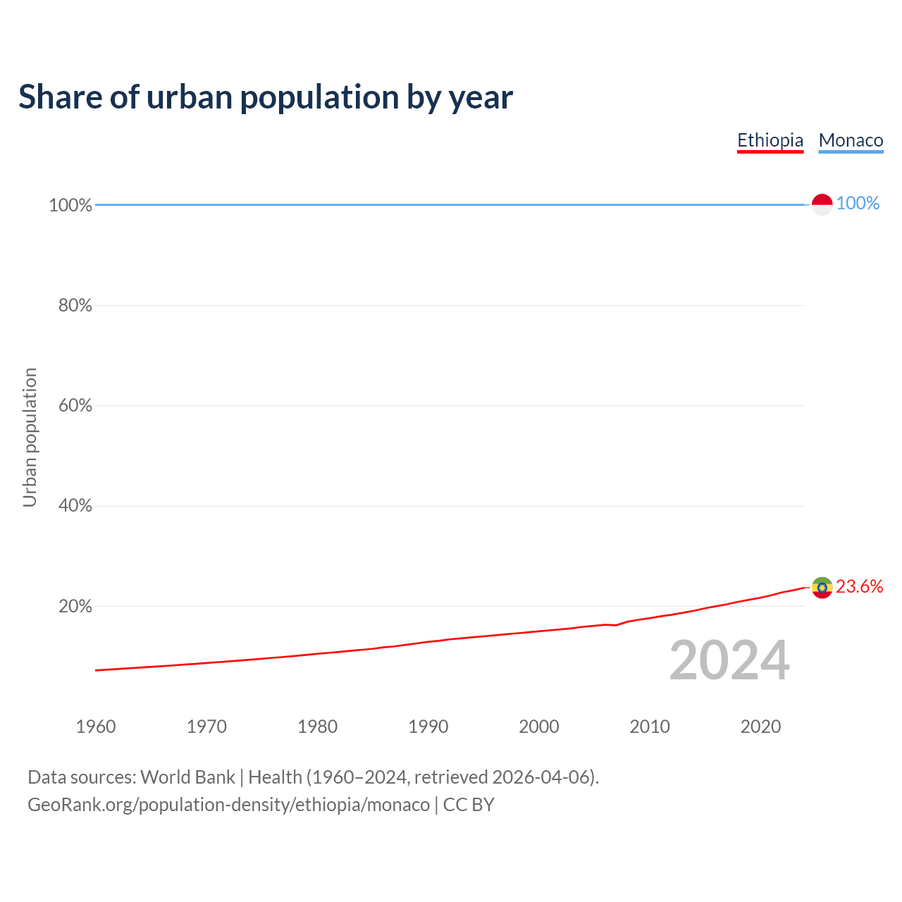From 2004 to 2024, the share of urban population changed from 15.8% to 23.6% in Ethiopia and from 100% to 100% in Monaco.