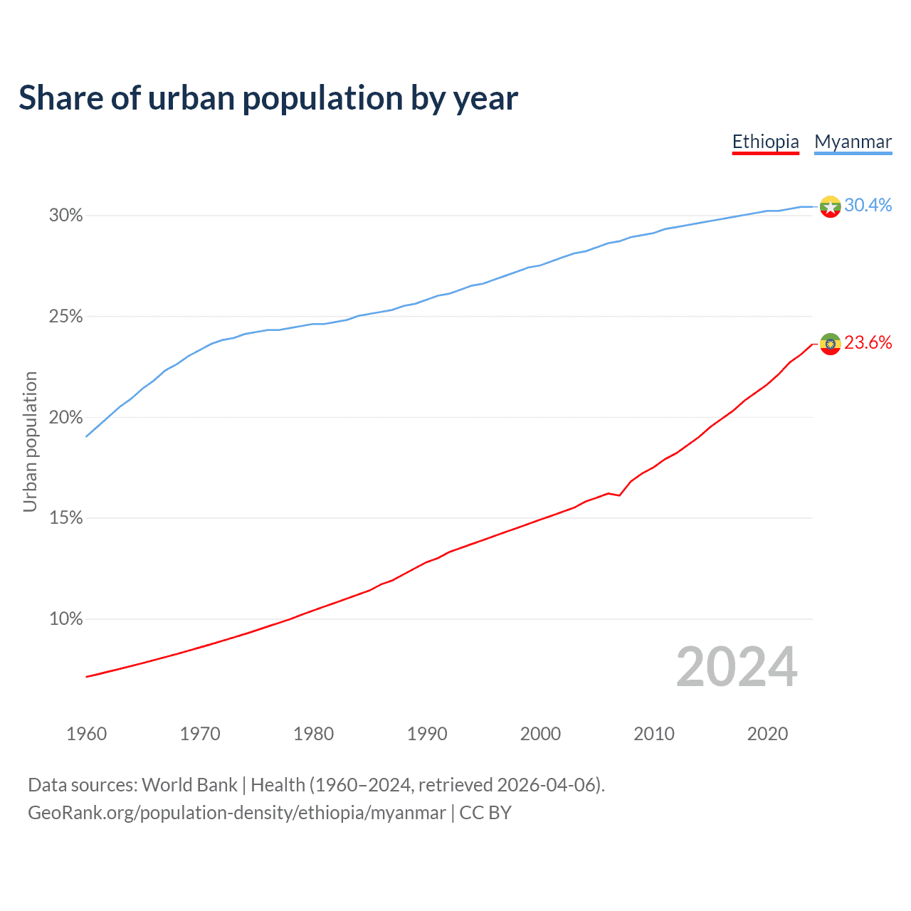 From 2004 to 2024, the share of urban population changed from 15.8% to 23.6% in Ethiopia and from 28.2% to 30.4% in Myanmar.