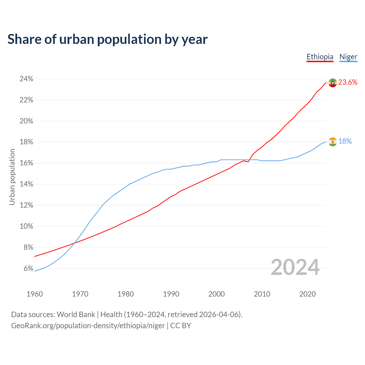 From 2004 to 2024, the share of urban population changed from 15.8% to 23.6% in Ethiopia and from 16.3% to 18% in Niger.