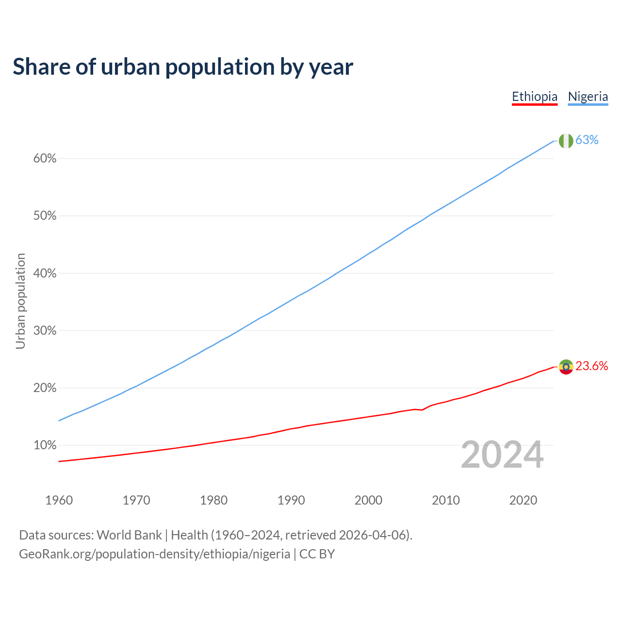 From 2004 to 2024, the share of urban population changed from 15.8% to 23.6% in Ethiopia and from 46.7% to 63% in Nigeria.