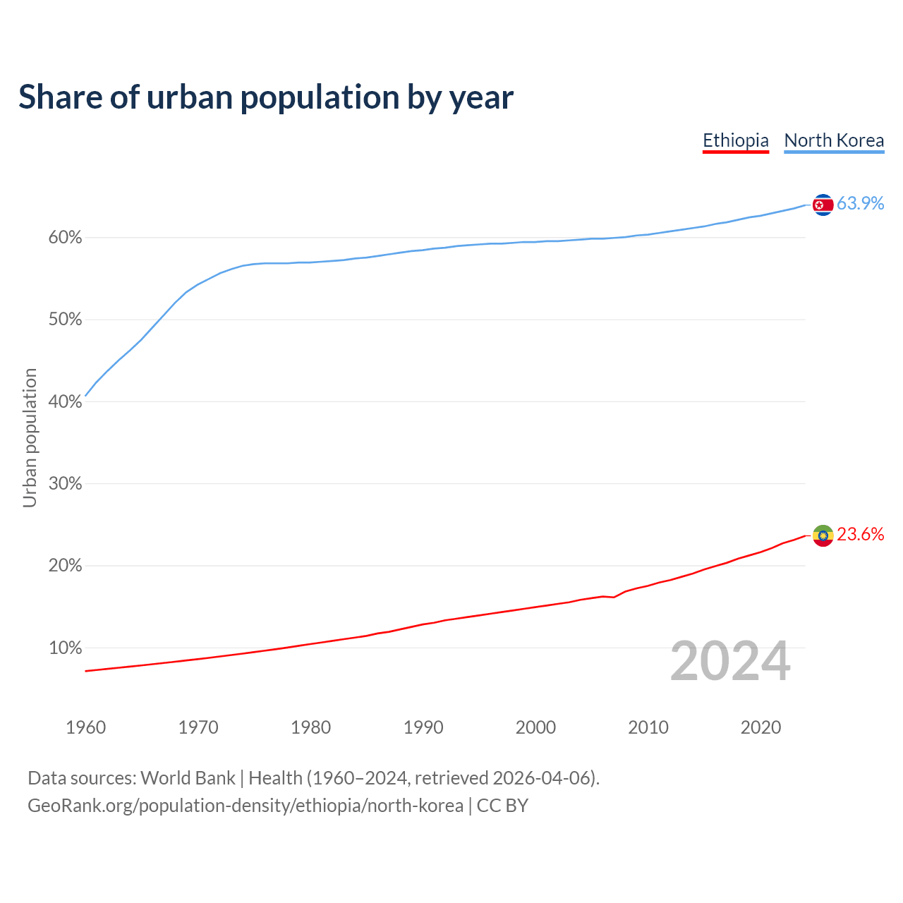 From 2004 to 2024, the share of urban population changed from 15.8% to 23.6% in Ethiopia and from 59.7% to 63.9% in North Korea.