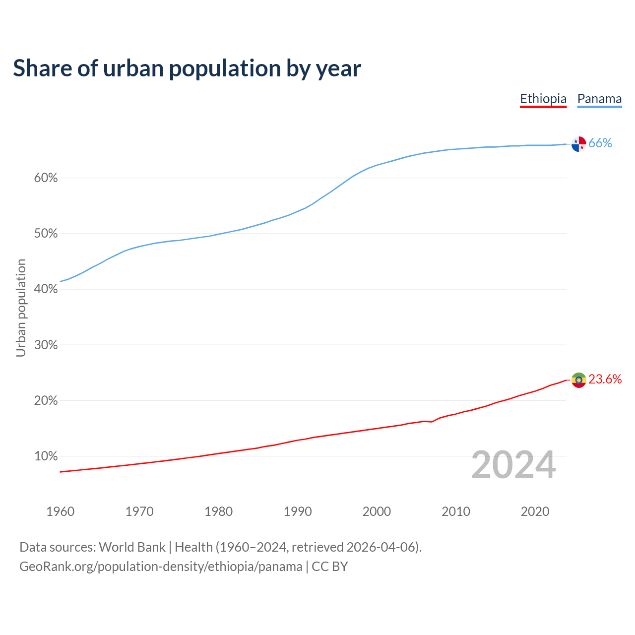 From 2004 to 2024, the share of urban population changed from 15.8% to 23.6% in Ethiopia and from 63.8% to 66% in Panama.