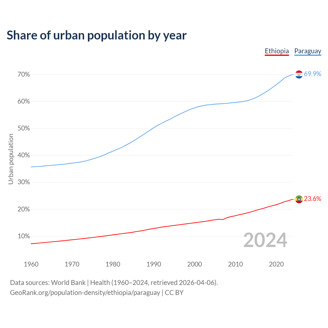 From 2004 to 2024, the share of urban population changed from 15.8% to 23.6% in Ethiopia and from 58.7% to 69.9% in Paraguay.