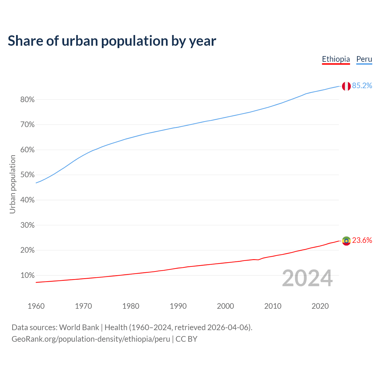 From 2004 to 2024, the share of urban population changed from 15.8% to 23.6% in Ethiopia and from 74.4% to 85.2% in Peru.