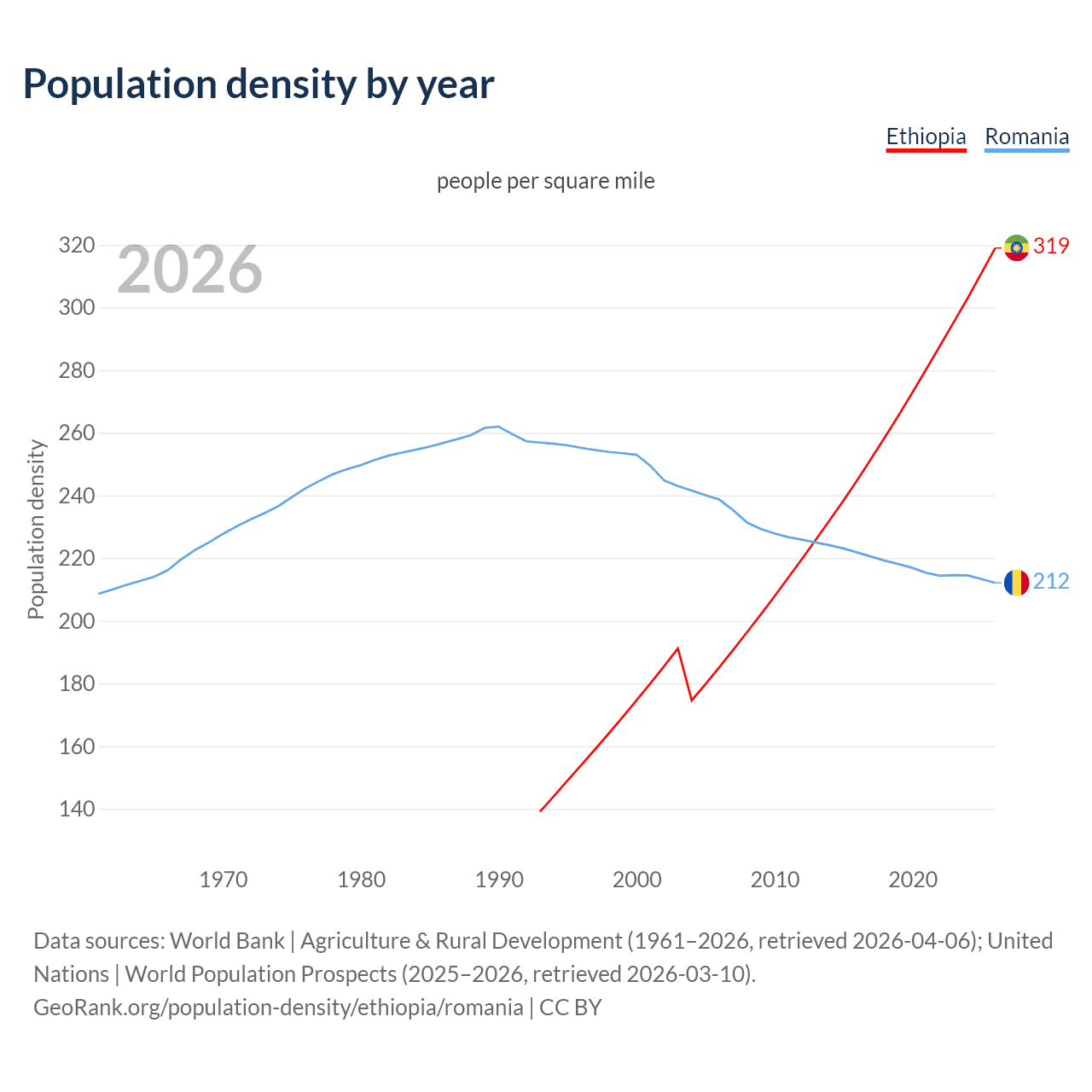 From 2006 to 2026, population density in Ethiopia increased by 72.2%, compared to a 11.1% decline in Romania.