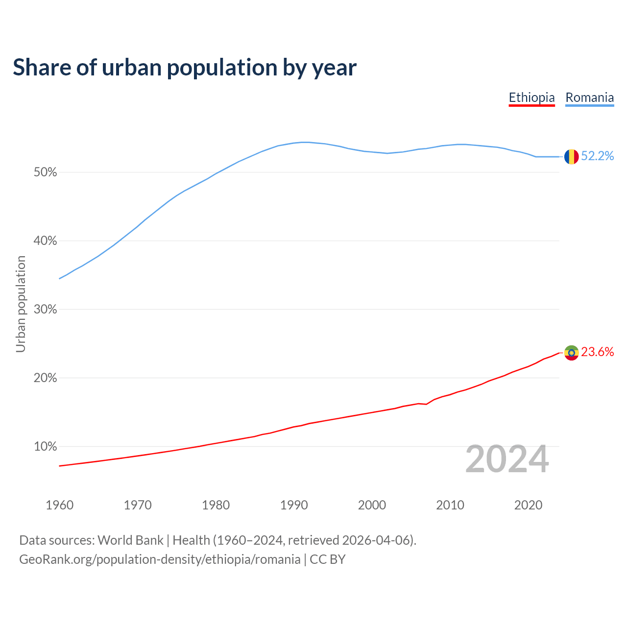 From 2004 to 2024, the share of urban population changed from 15.8% to 23.6% in Ethiopia and from 52.9% to 52.2% in Romania.