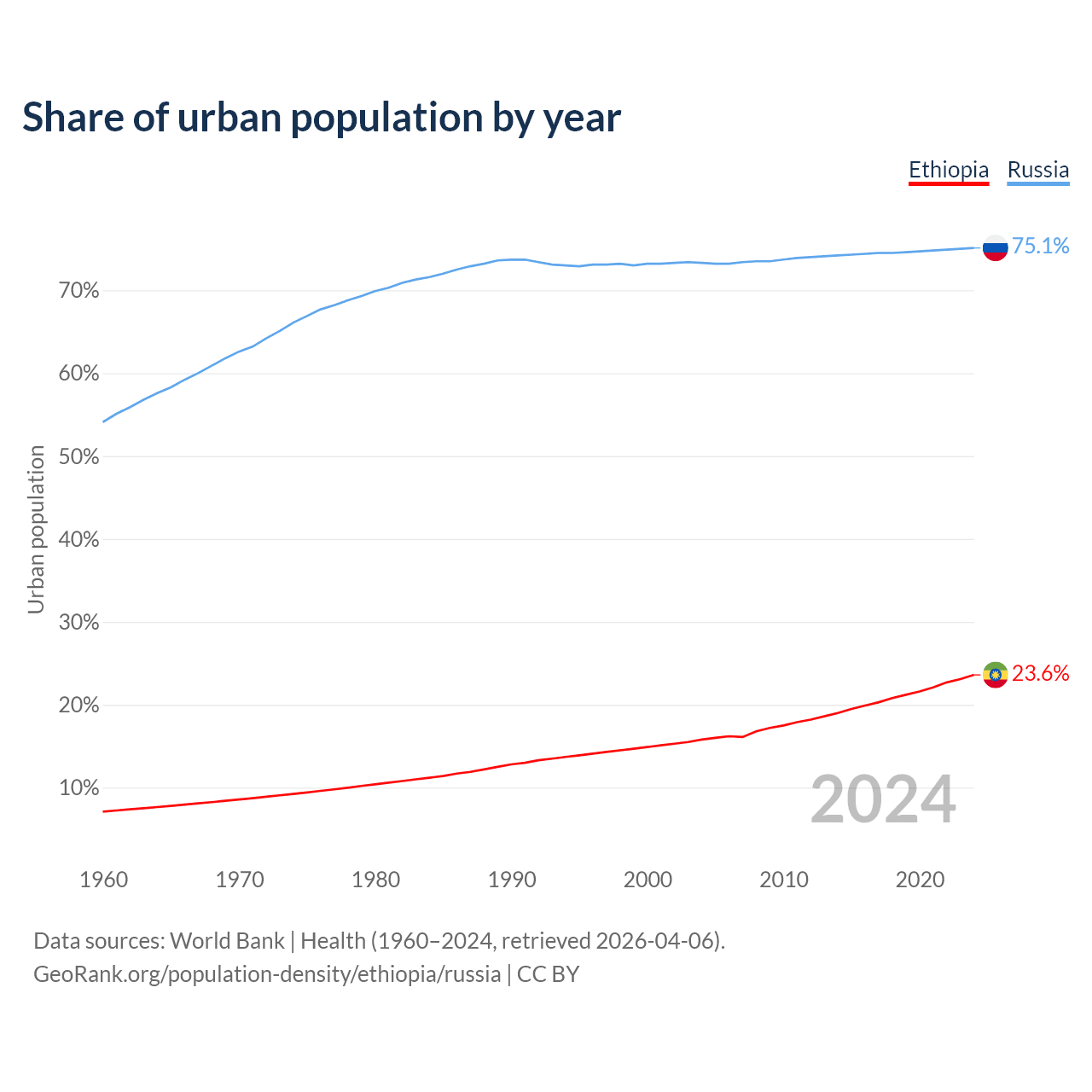 From 2004 to 2024, the share of urban population changed from 15.8% to 23.6% in Ethiopia and from 73.3% to 75.1% in Russia.