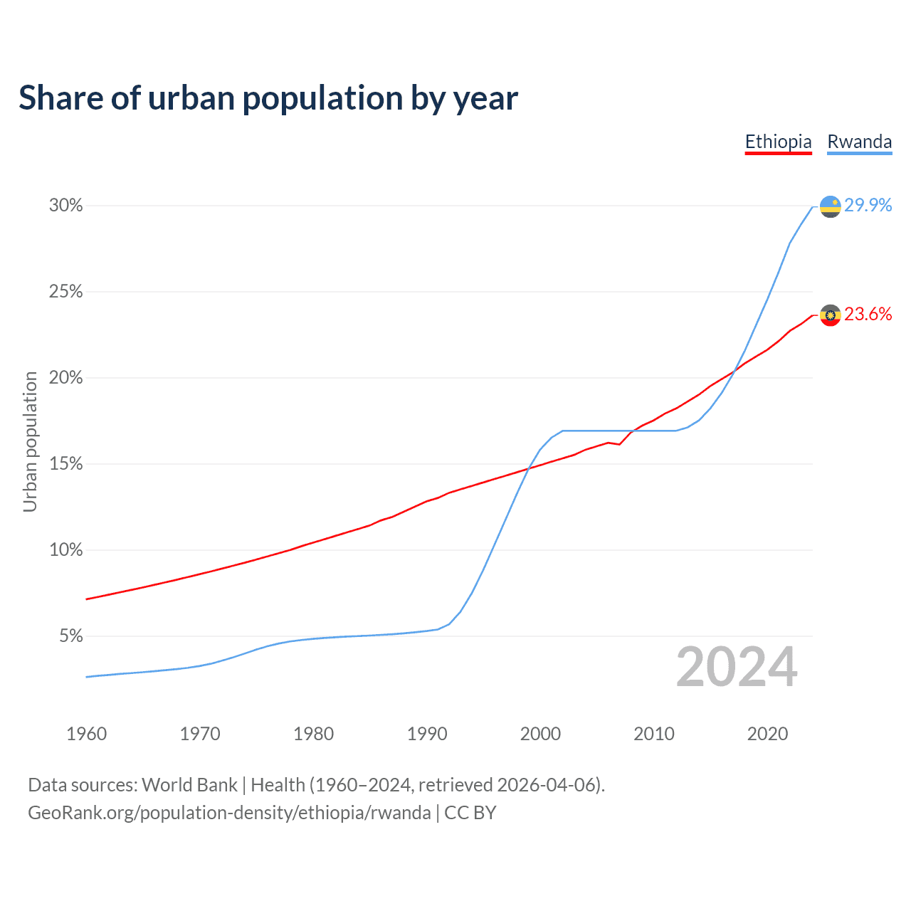 From 2004 to 2024, the share of urban population changed from 15.8% to 23.6% in Ethiopia and from 16.9% to 29.9% in Rwanda.