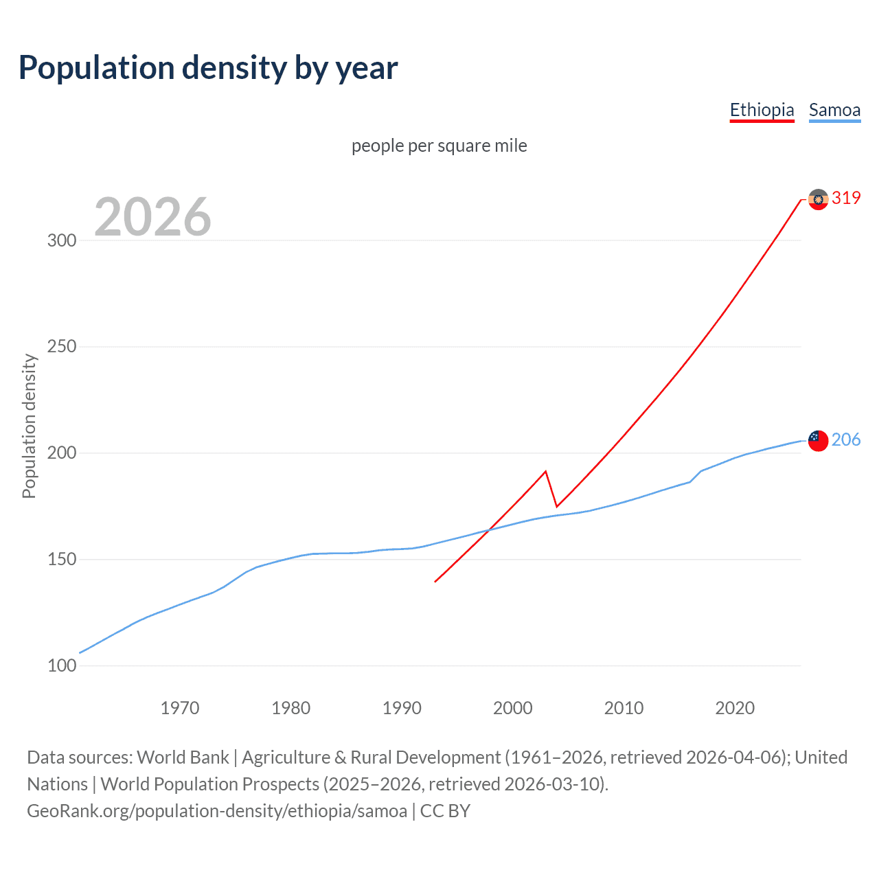 From 2006 to 2026, population density in Ethiopia increased by 72.2%, compared to a 19.6% growth in Samoa.