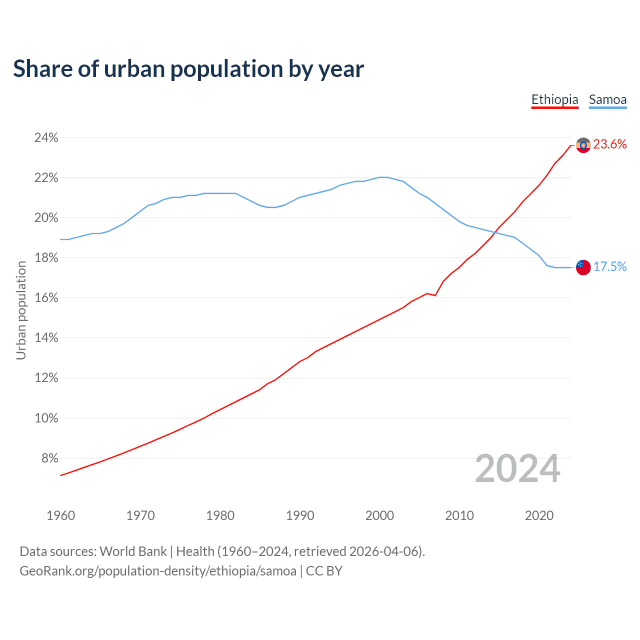 From 2004 to 2024, the share of urban population changed from 15.8% to 23.6% in Ethiopia and from 21.5% to 17.5% in Samoa.