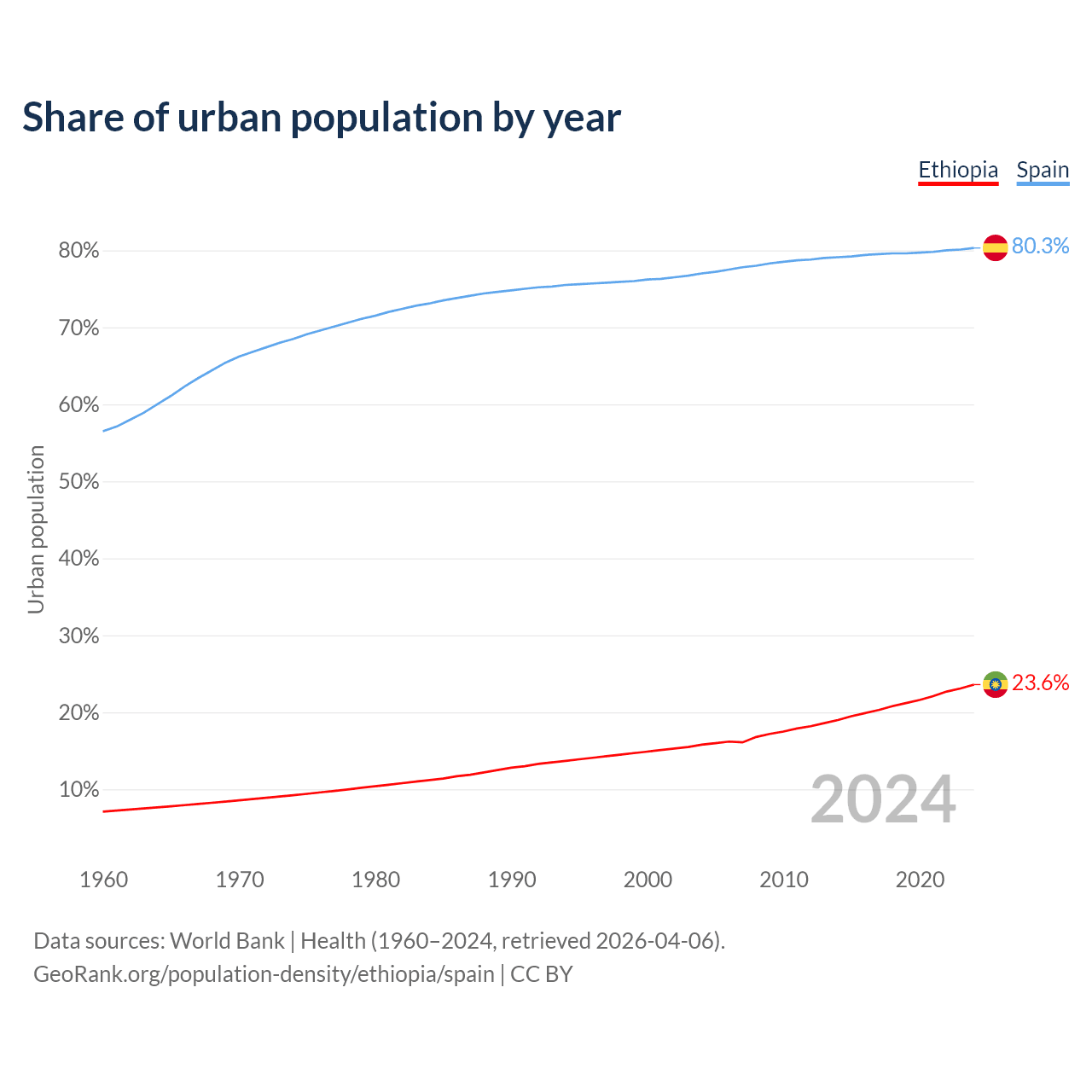 From 2004 to 2024, the share of urban population changed from 15.8% to 23.6% in Ethiopia and from 77% to 80.3% in Spain.