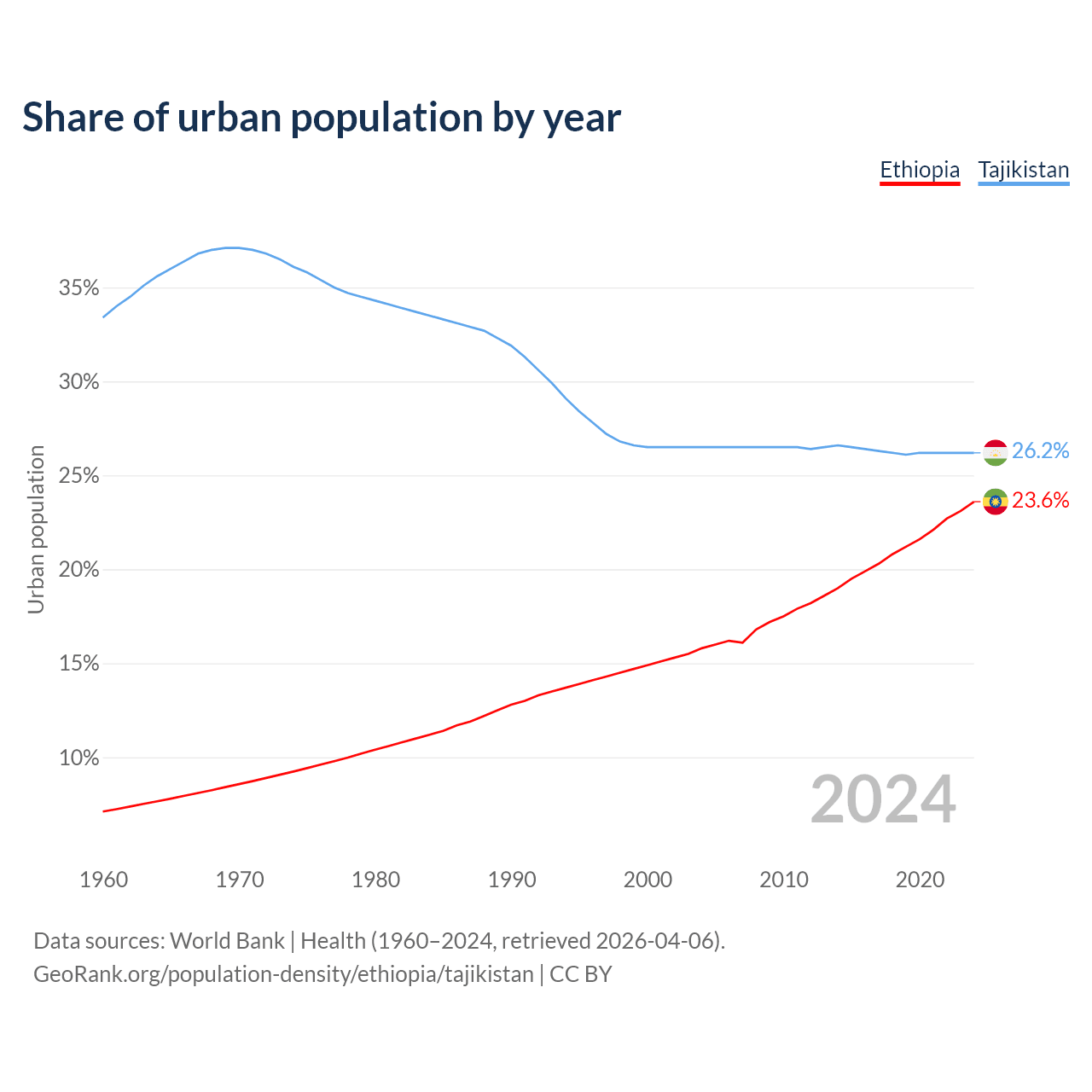 From 2004 to 2024, the share of urban population changed from 15.8% to 23.6% in Ethiopia and from 26.5% to 26.2% in Tajikistan.