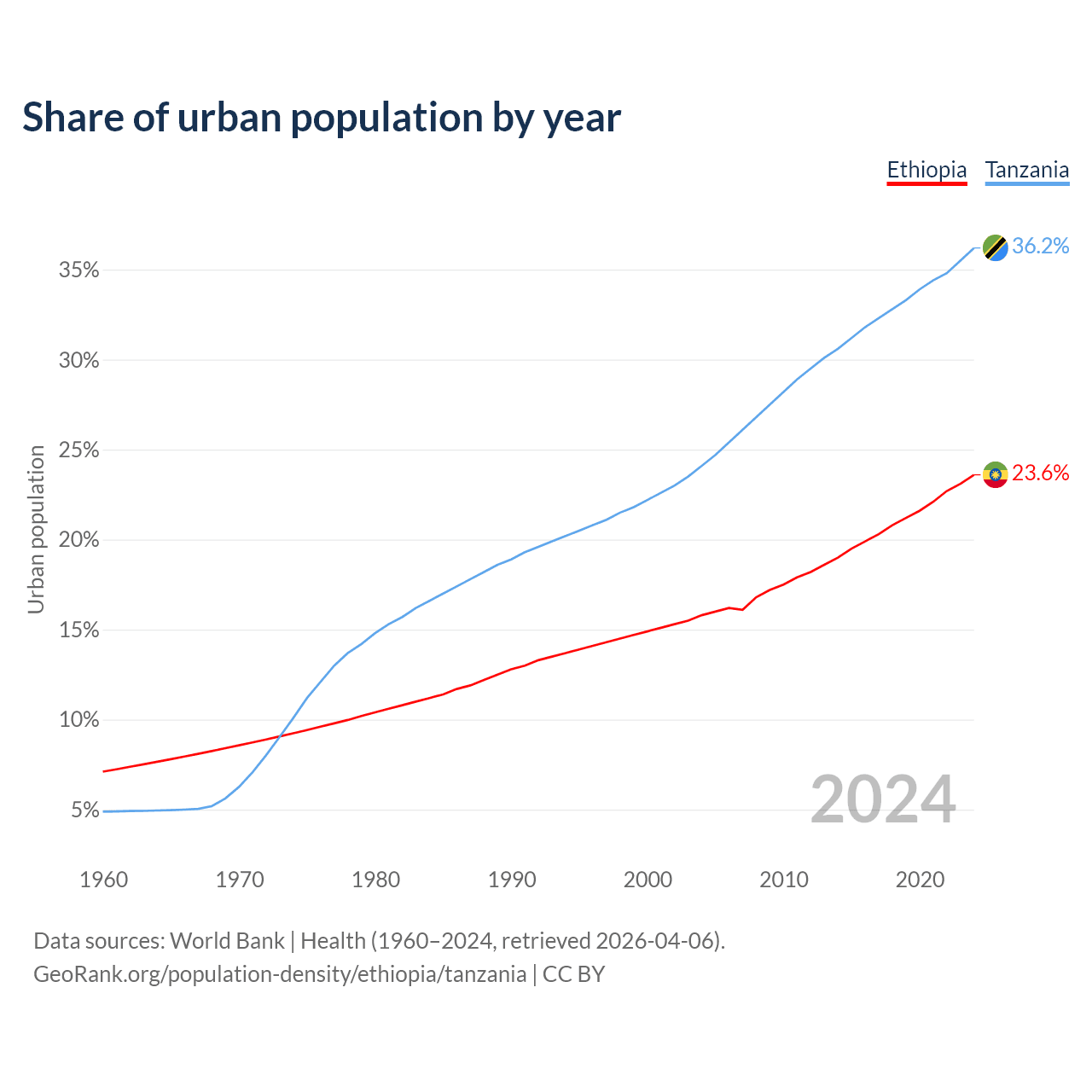 From 2004 to 2024, the share of urban population changed from 15.8% to 23.6% in Ethiopia and from 24.1% to 36.2% in Tanzania.