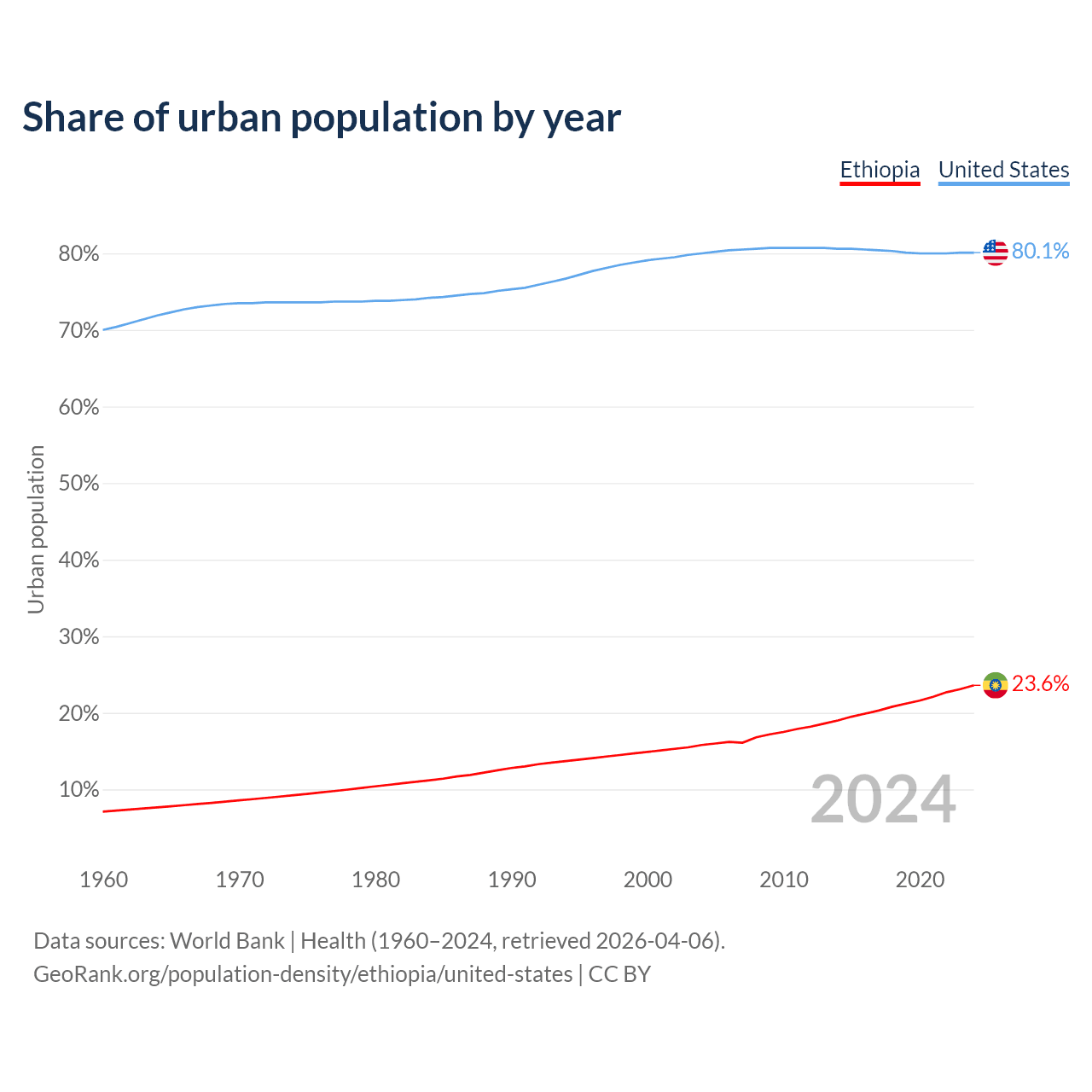 From 2004 to 2024, the share of urban population changed from 15.8% to 23.6% in Ethiopia and from 80% to 80.1% in the United States.