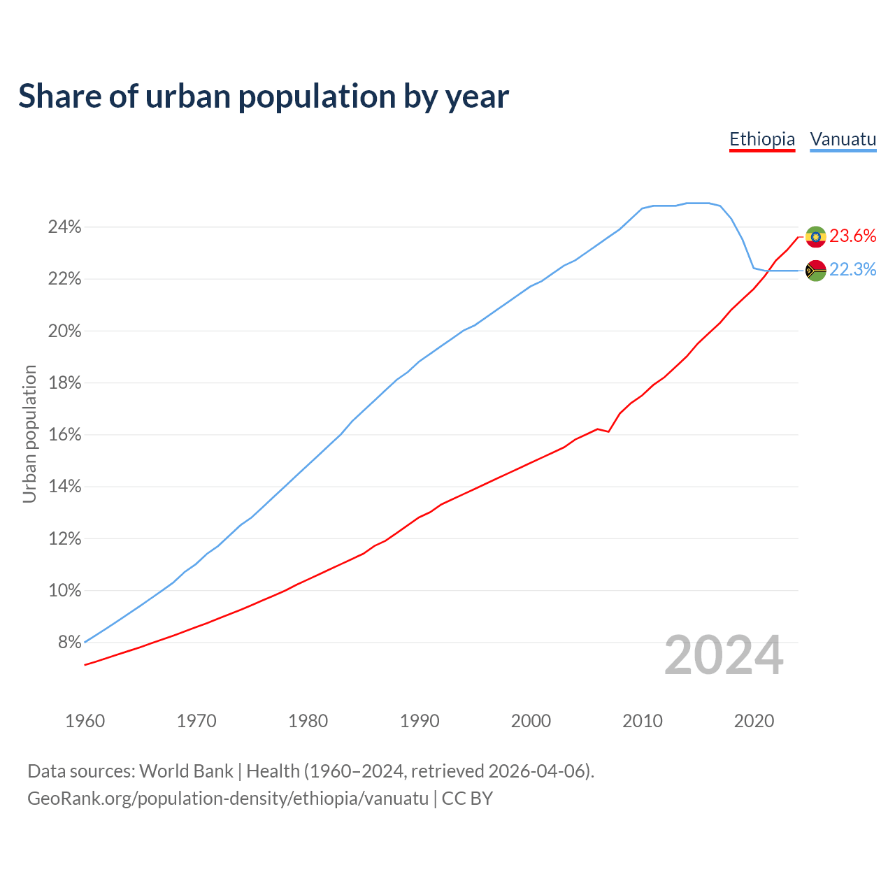 From 2004 to 2024, the share of urban population changed from 15.8% to 23.6% in Ethiopia and from 22.7% to 22.3% in Vanuatu.