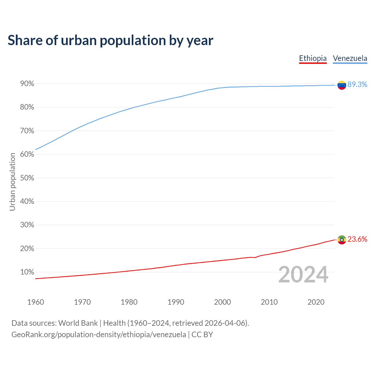 From 2004 to 2024, the share of urban population changed from 15.8% to 23.6% in Ethiopia and from 88.6% to 89.3% in Venezuela.