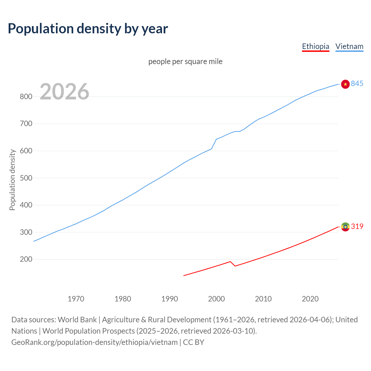 From 2006 to 2026, population density in Ethiopia increased by 72.2%, compared to a 24.1% growth in Vietnam.