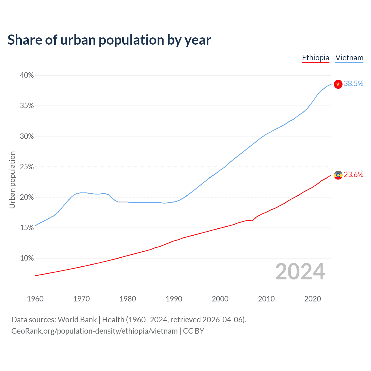 From 2004 to 2024, the share of urban population changed from 15.8% to 23.6% in Ethiopia and from 26.8% to 38.5% in Vietnam.