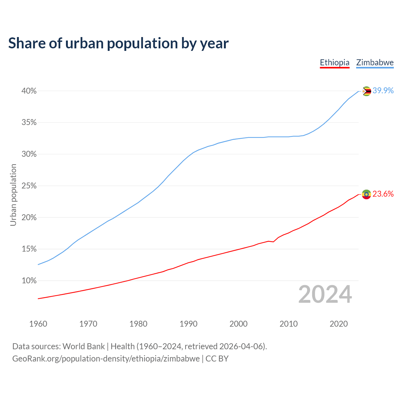 From 2004 to 2024, the share of urban population changed from 15.8% to 23.6% in Ethiopia and from 32.6% to 39.9% in Zimbabwe.