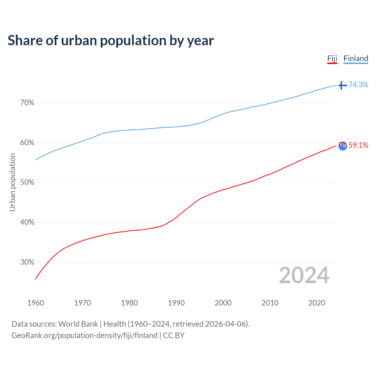 From 2004 to 2024, the share of urban population changed from 49.5% to 59.1% in Fiji and from 68.3% to 74.3% in Finland.