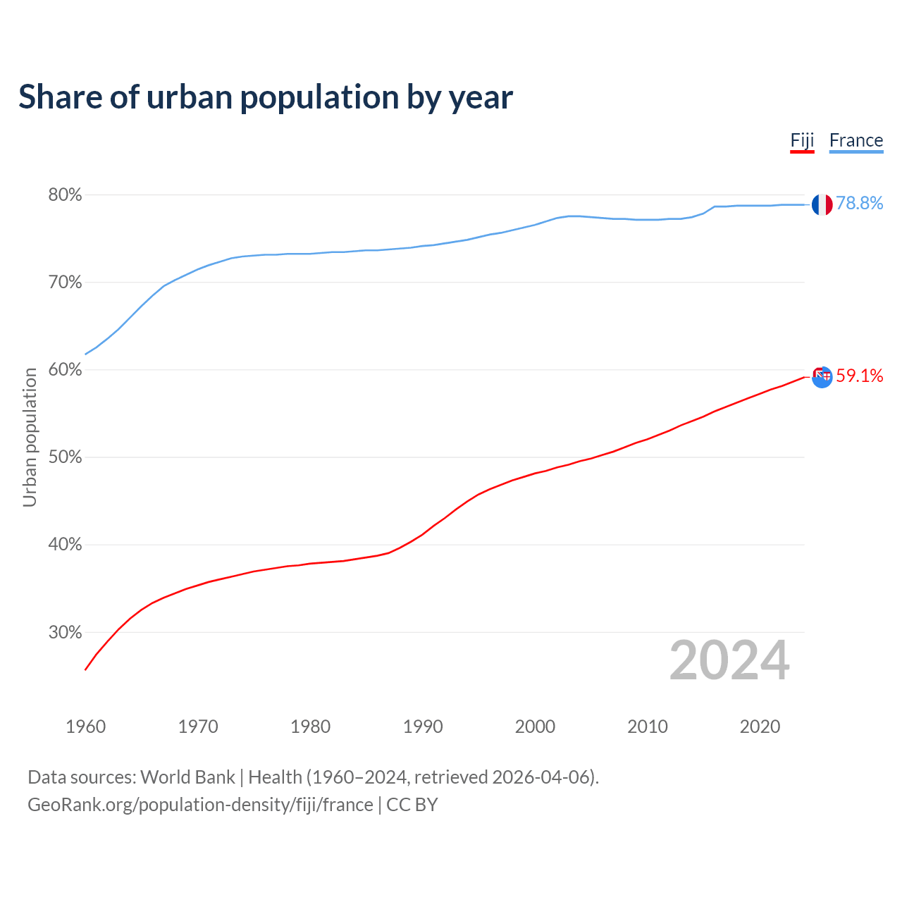 From 2004 to 2024, the share of urban population changed from 49.5% to 59.1% in Fiji and from 77.5% to 78.8% in France.
