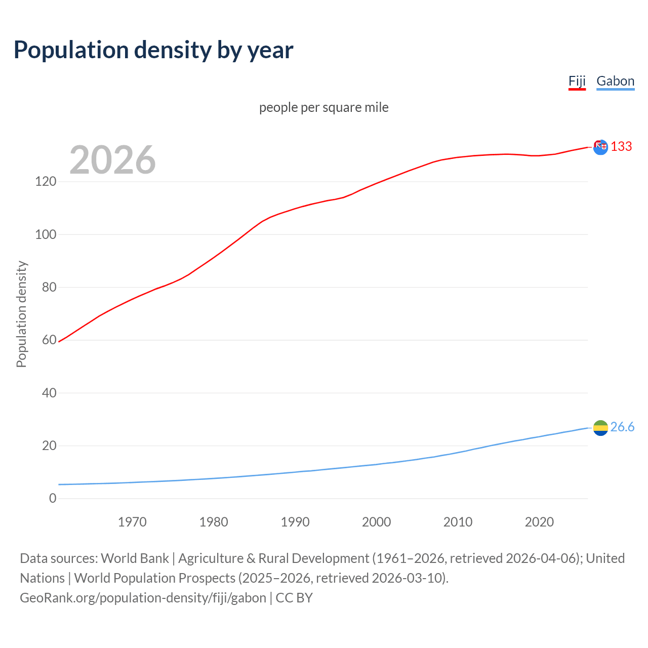 From 2006 to 2026, population density in Fiji increased by 5.3%, compared to a 75.6% growth in Gabon.