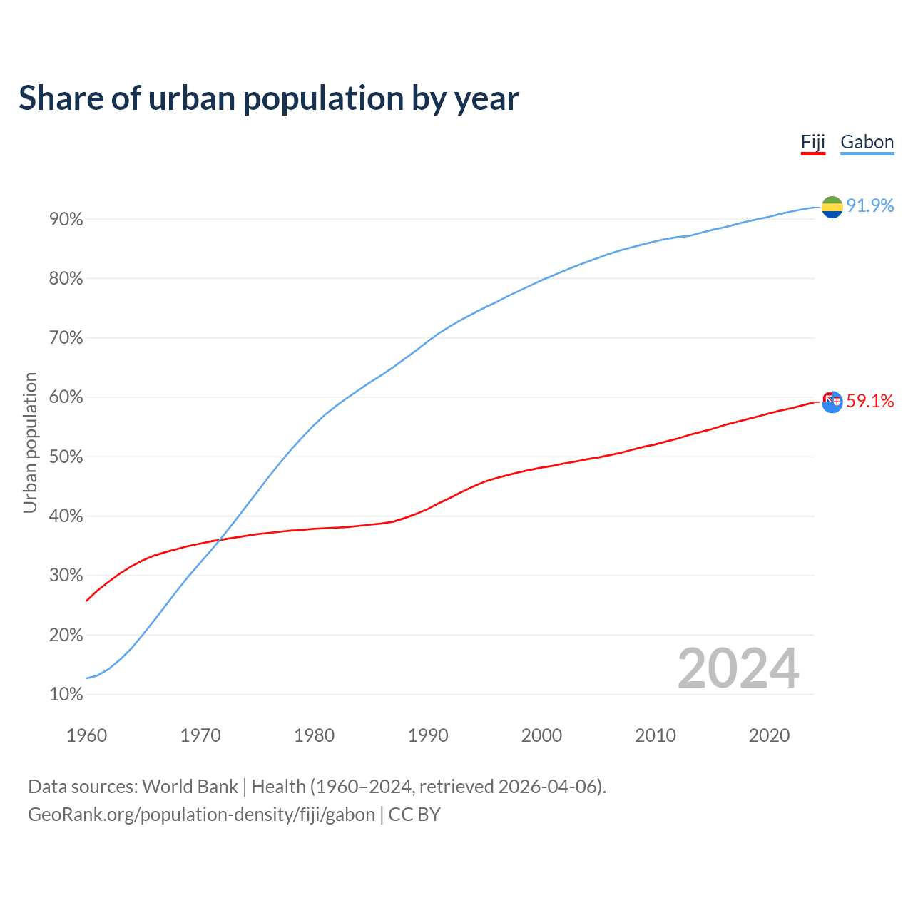 From 2004 to 2024, the share of urban population changed from 49.5% to 59.1% in Fiji and from 82.7% to 91.9% in Gabon.