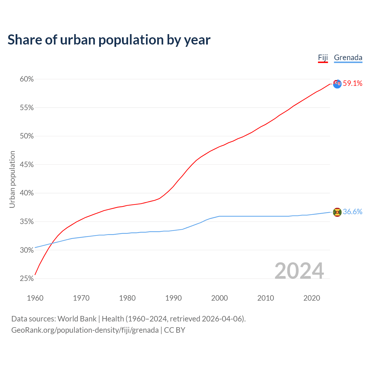 From 2004 to 2024, the share of urban population changed from 49.5% to 59.1% in Fiji and from 35.9% to 36.6% in Grenada.