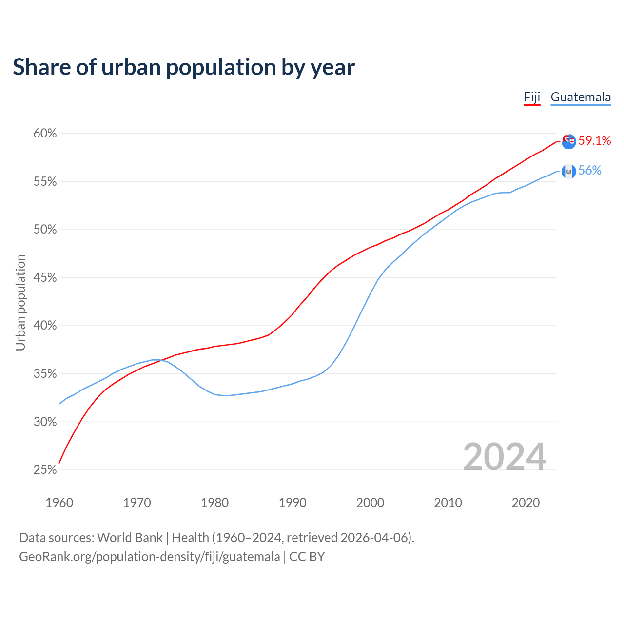 From 2004 to 2024, the share of urban population changed from 49.5% to 59.1% in Fiji and from 47.3% to 56% in Guatemala.