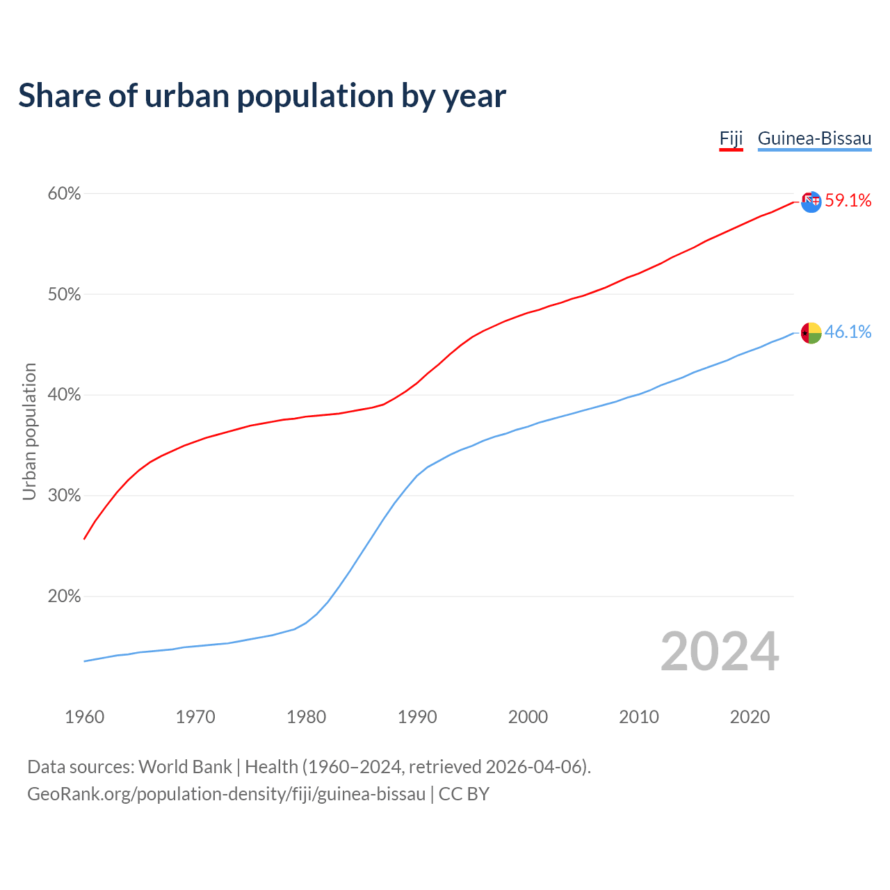 From 2004 to 2024, the share of urban population changed from 49.5% to 59.1% in Fiji and from 38.1% to 46.1% in Guinea-Bissau.