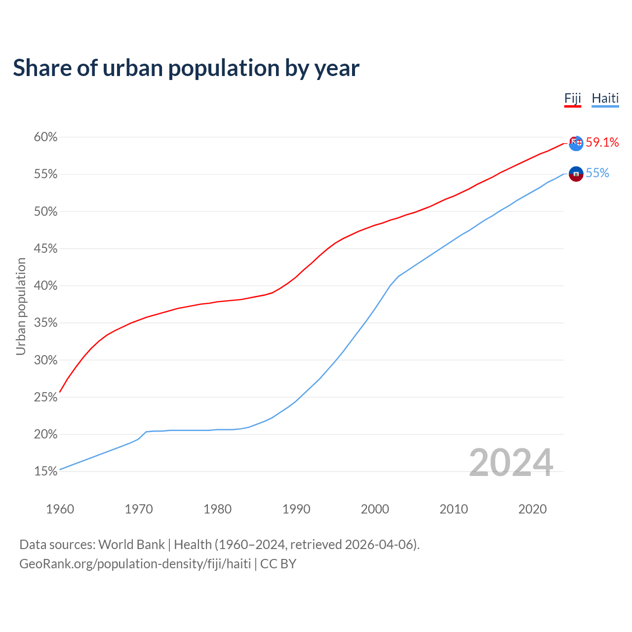 From 2004 to 2024, the share of urban population changed from 49.5% to 59.1% in Fiji and from 41.9% to 55% in Haiti.