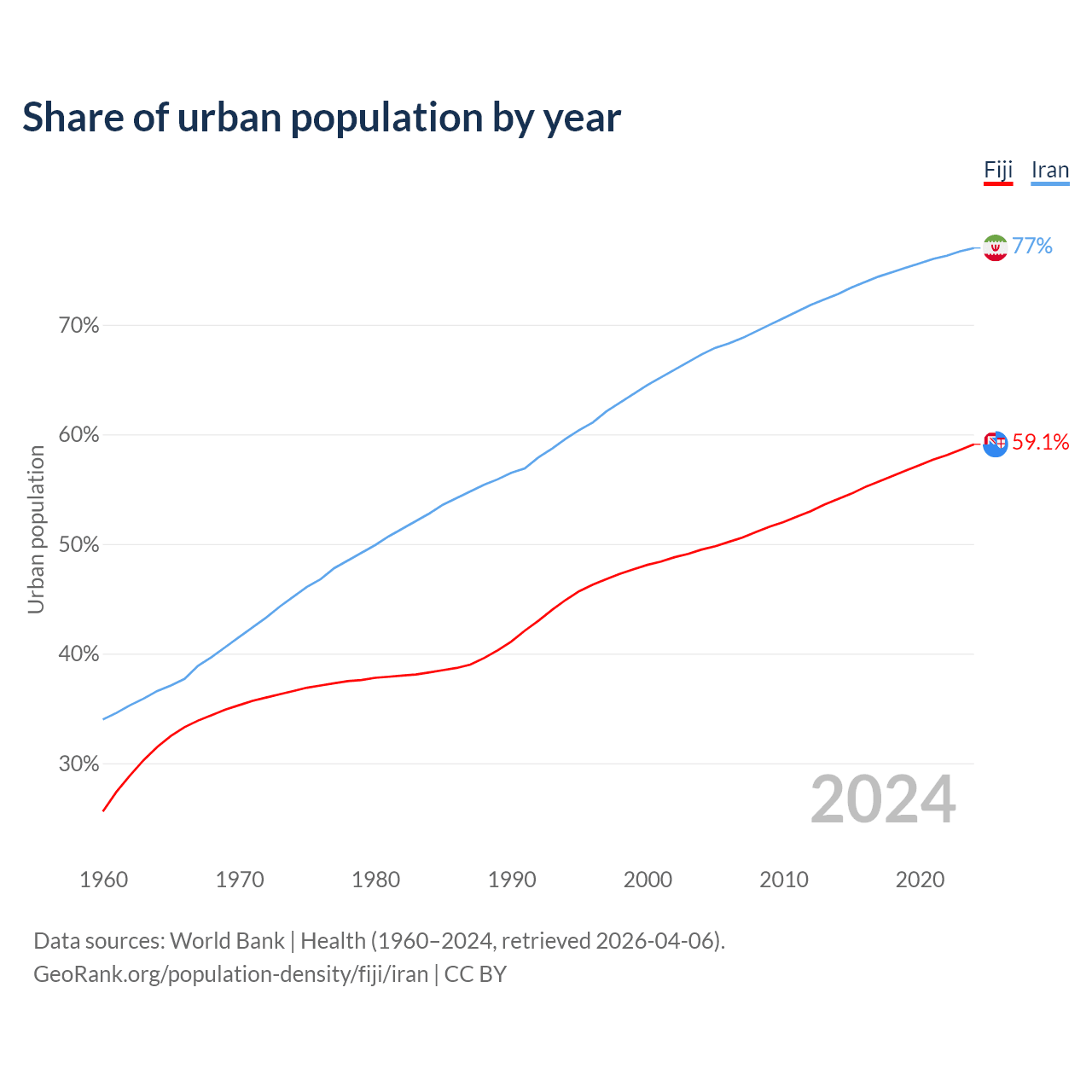 From 2004 to 2024, the share of urban population changed from 49.5% to 59.1% in Fiji and from 67.3% to 77% in Iran.