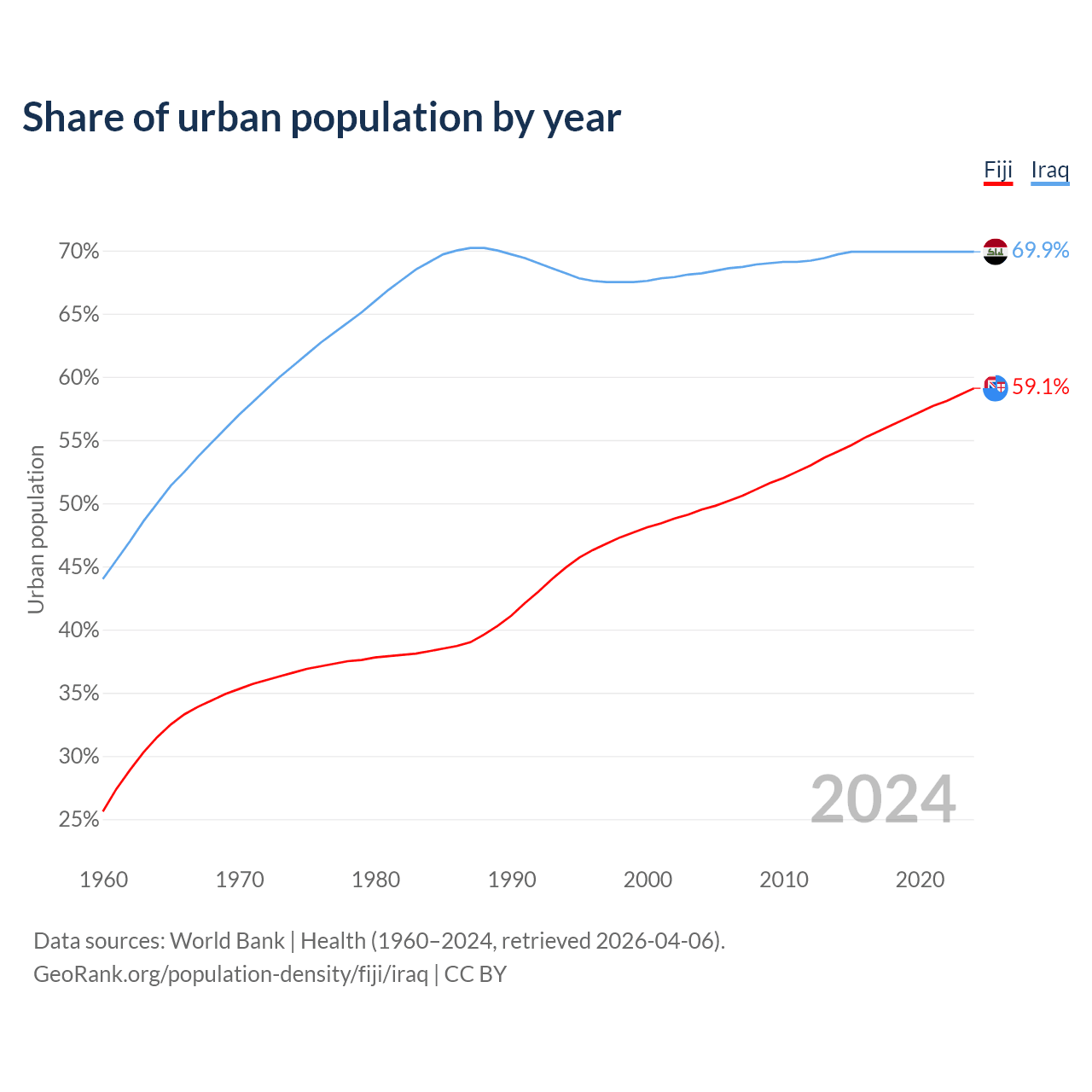 From 2004 to 2024, the share of urban population changed from 49.5% to 59.1% in Fiji and from 68.2% to 69.9% in Iraq.